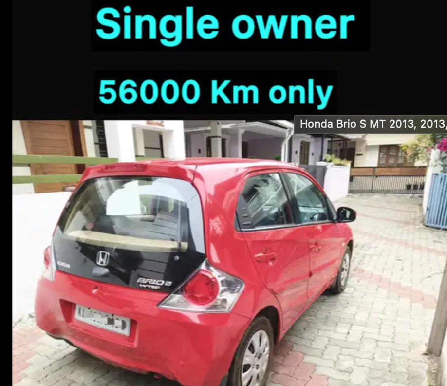 2013 Brio smt Single owner Company service 2.95 lak 2.25 loan ADDITIONAL VEHICLE INFORMATION: ABS: Yes Accidental: No Adjustable Steering: Yes Anti Theft Device: Yes Aux Compatibility: Yes Battery Condition: New Vehicle Certified: Yes Color: Red Insurance Type: Comprehensive Make Month: August Parking Sensors: Yes Power steering: Yes Power Windows: Front & rear AM/FM Radio: Yes Registration Place: KL Finance: Yes Service History: Available Tyre Condition: New USB Compatibility: Yes