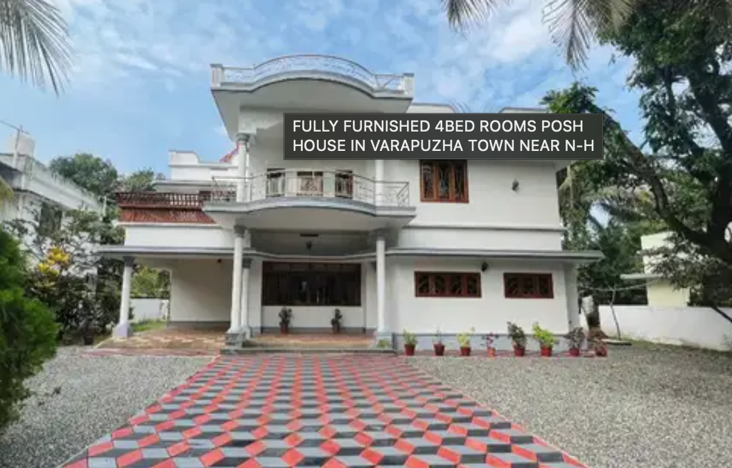FULLY FURNISHED 4BED ROOMS POSH HOUSE FOR RENT IN VARAPUZHA TOWN NEAR N-H 4BED ROOMS WITH BATH ATTACHED * FULLY FURNISHED WITH ALL EVERY THINGS IS AVAILABLE * 4 AND MORE CAR PARKING SPACE * 4 SIDE COMPOUND WALL AND GATE * EASY ACCESS TO N-H 66 VARAPUZHA JUNCTION 7 KM AWAY FROM EDAP.ALLY 5 KM AWAY FROM AMRITHA JUNCTION 2 KM AWAY FROM CHERANALLUR SIGNAL 1 KM AWAY FROM KOONAMMAV JUNCTION READY TO MOVE WITH COMPLETE FEATURES ALL FACILITIES ARE VERY NEAR ASKING PRICE. 30K FOR MORE DETAILS TOUCH IN WITH ME.